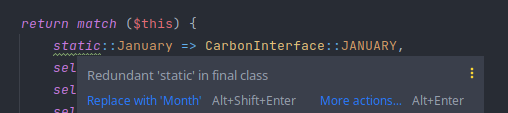 @@ -0,0 +37,4 @@self::September => CarbonInterface::SEPTEMBER,self::October => CarbonInterface::OCTOBER,self::November => CarbonInterface::NOVEMBER,self::December => CarbonInterface::DECEMBER,Plus maybe some exception could be thrown on unknow value/default?